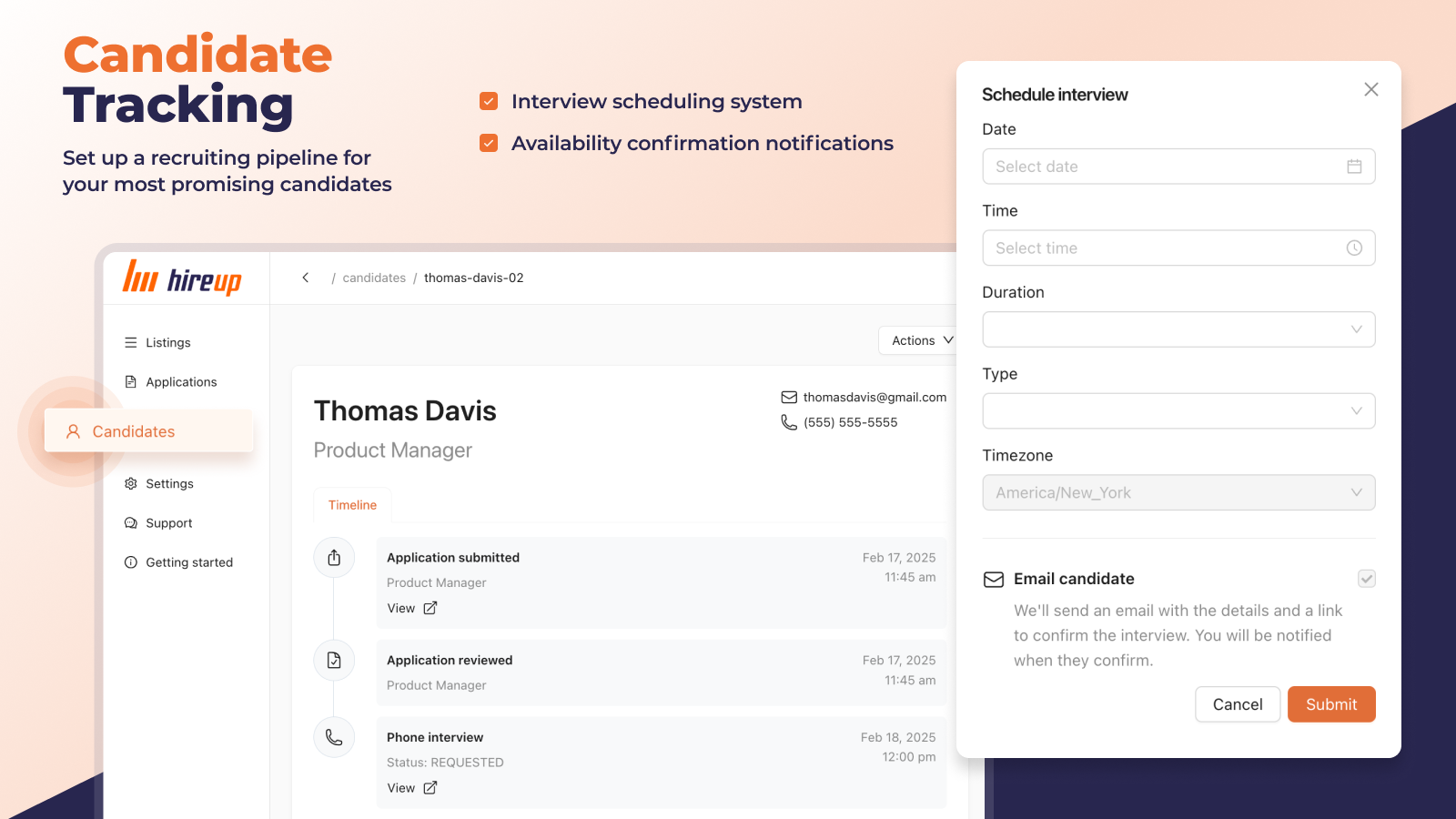 Follow every candidate's journey from application to hire in one organized dashboard. See who's applied, review resumes, leave notes, and move candidates through your hiring stages.