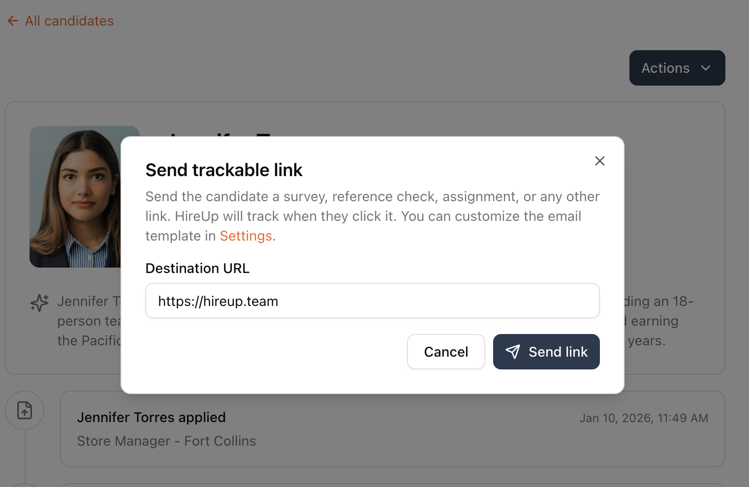 Send candidates any link — surveys, reference checks, assignments — and know when they click.